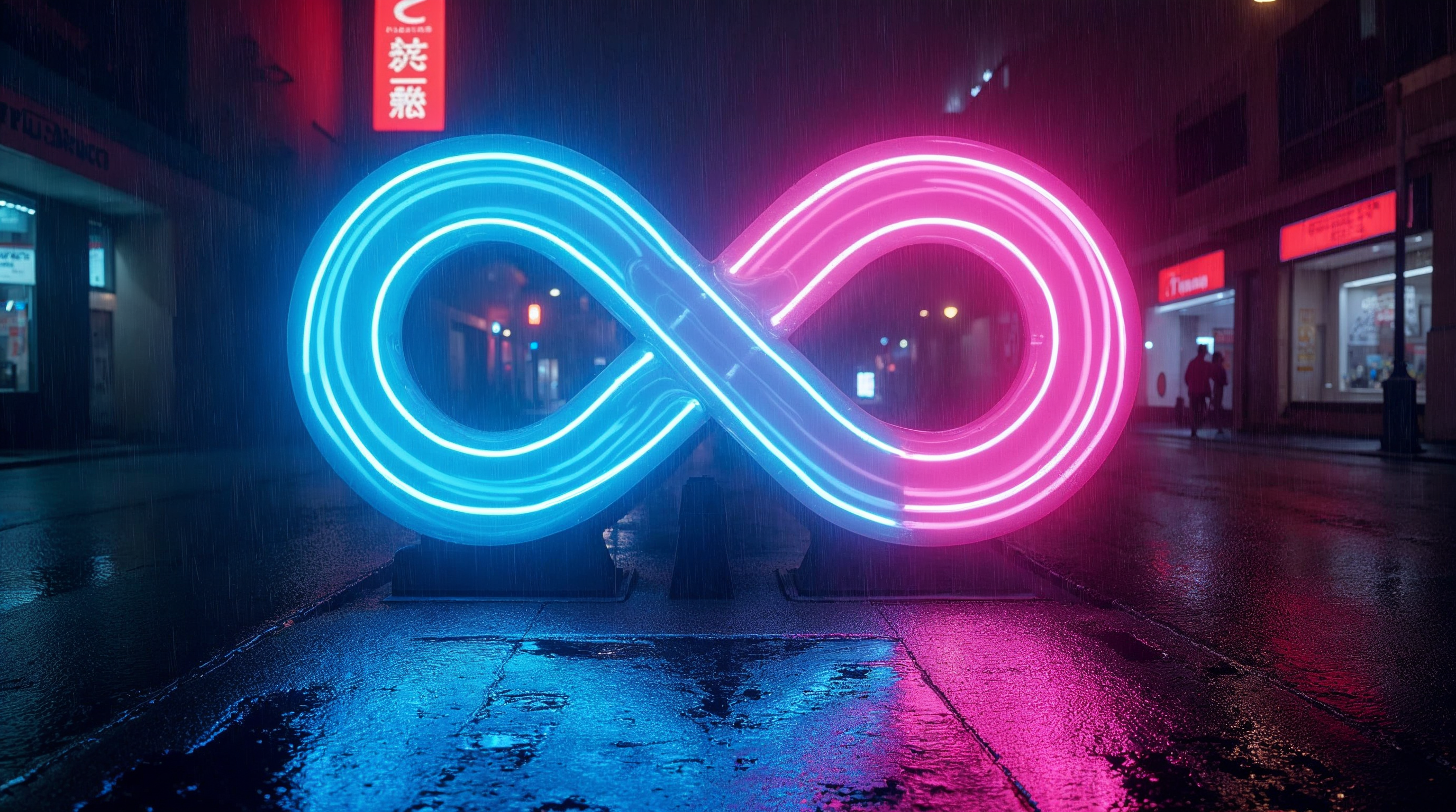 Chinese signs, blue neon, blue pink, blurred figures, city lights, city night, cyberpunk, digital art, eternal symbol, futuristic art, glowing loops, glowing sign, infinity symbol, loop symbol, neon glow, neon lights, night city, night street, pink neon, rain street, reflections, street scene, urban street, vibrant colors, wet pavement, neon infinity