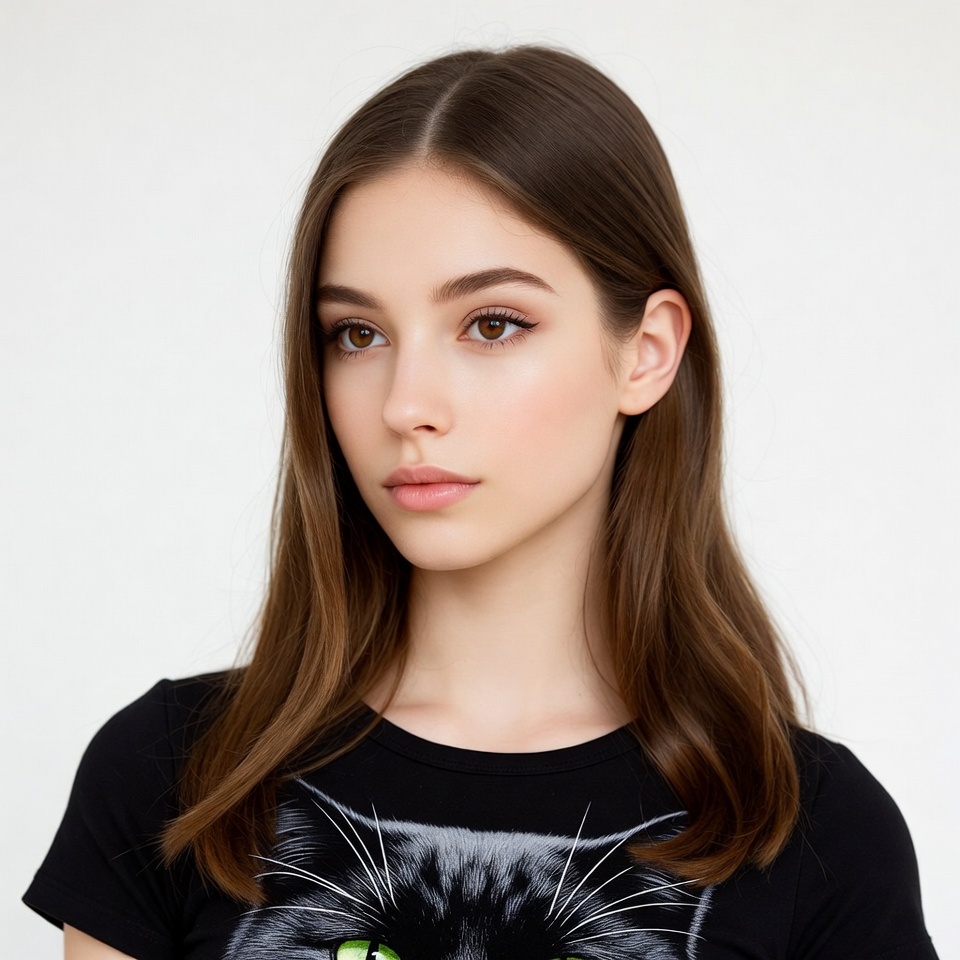 A young woman with long straight brown hair gazes slightly to the side against a white background. She wears a black t-shirt featuring a large green-eyed black cat graphic. Her makeup is natural with subtle pink lips and brown eyes.