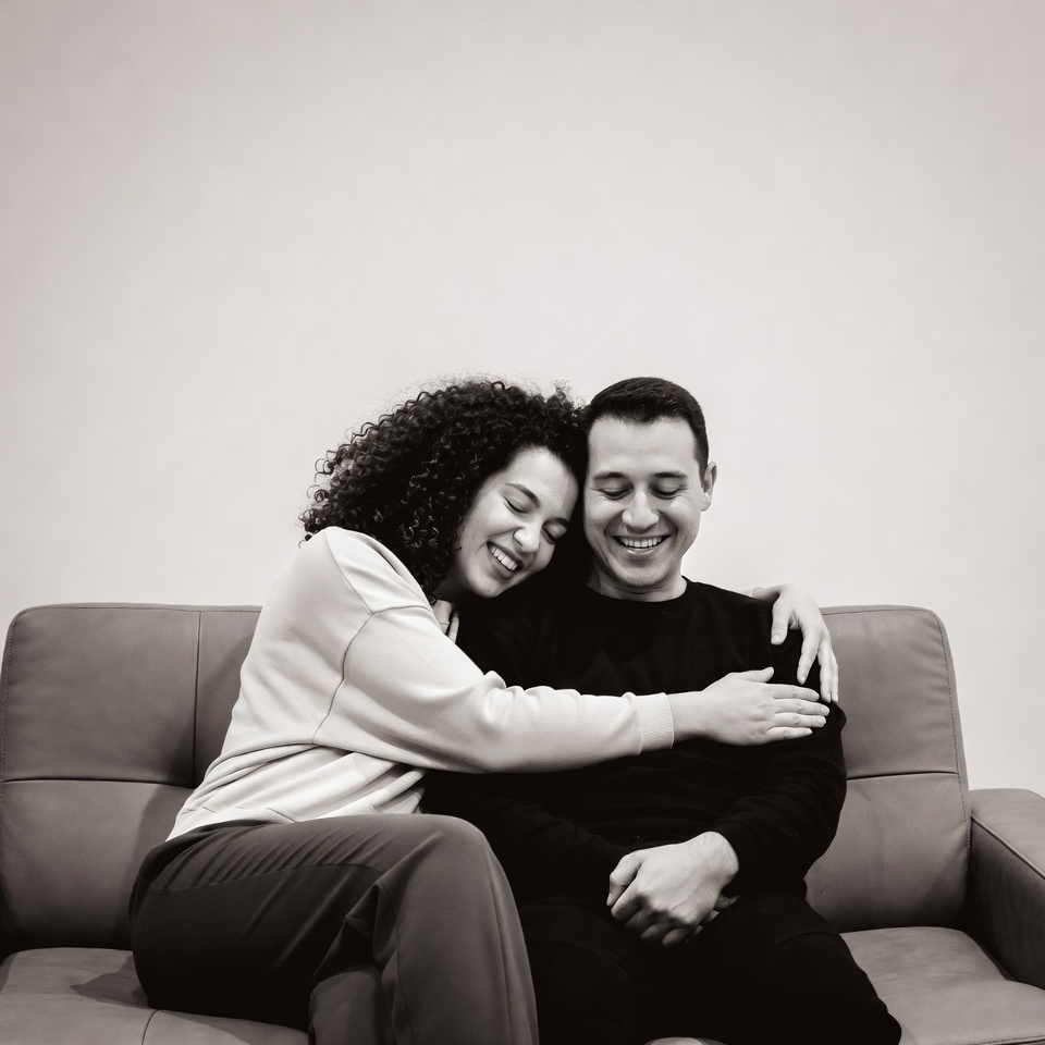 A smiling woman with curly hair hugs a smiling man on a gray couch in a black and white photo. She wears a light sweater and pants, while he wears a dark shirt. They sit close together with arms around each other against a plain background.
