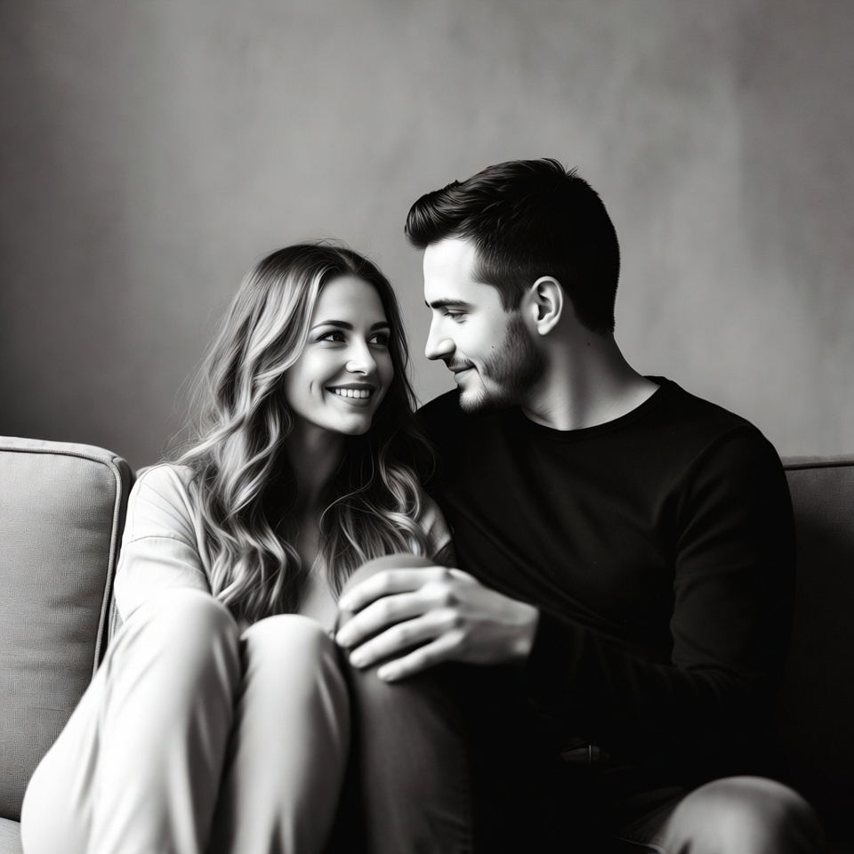 A young White woman with long wavy hair smiles warmly while gazing at a young White man on a gray couch. The man, dressed in a black sweater, holds her hand affectionately as they sit close together. The image is in black and white with a neutral studio background.