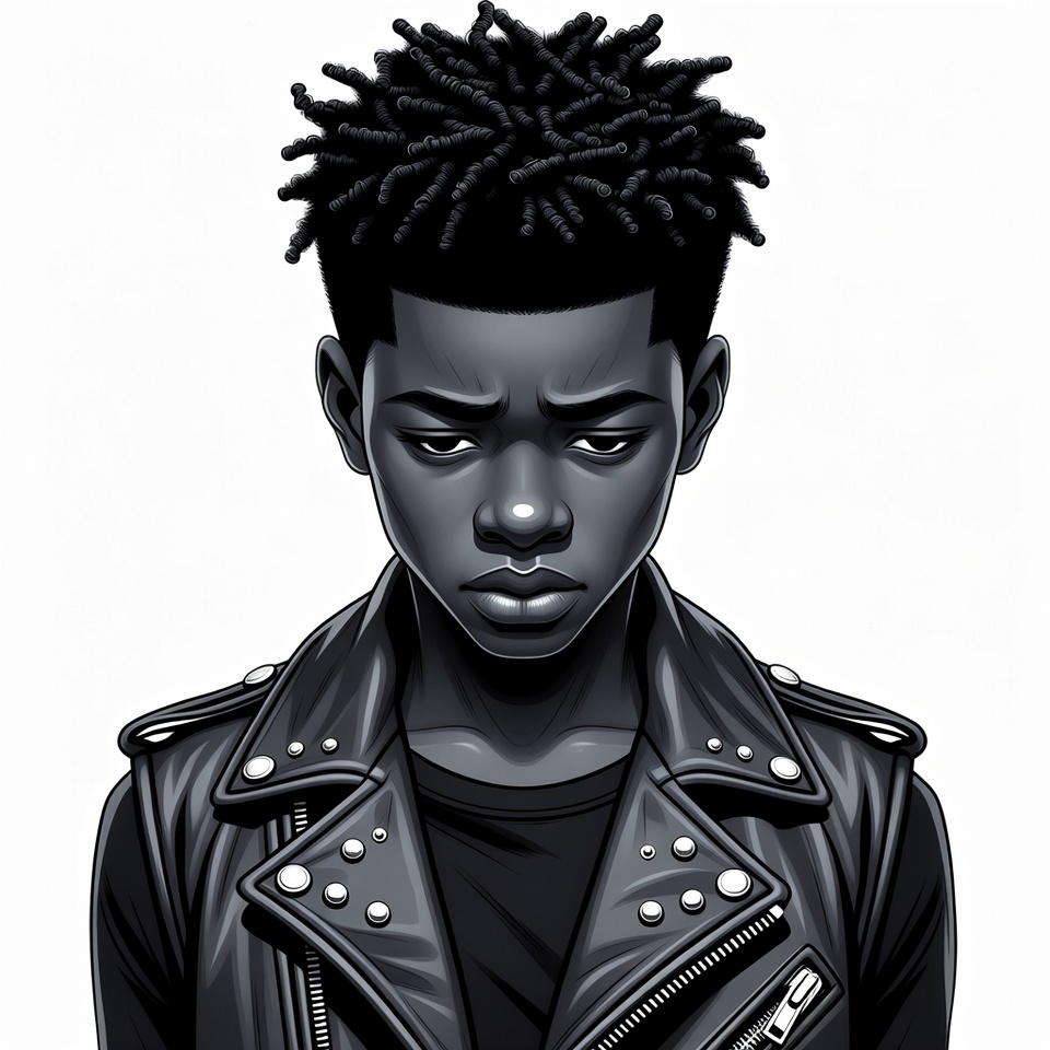 African-American, afro hair, black jacket, black t-shirt, curly hair, dreadlocks, illustration, leather jacket, male, portrait, serious expression, studs, stylish boy, white background, young boy, young man, boy