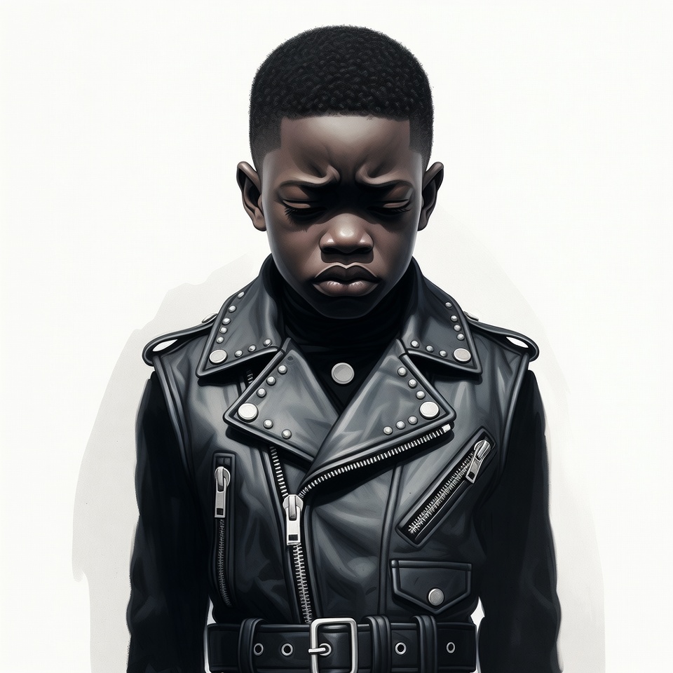 African-American, black jacket, brooding face, child, cool boy, fashion, high collar, illustration, kid, leather jacket, male, portrait, serious expression, short hair, silver studs, studs, stylish jacket, white background, young boy, zipper, boy