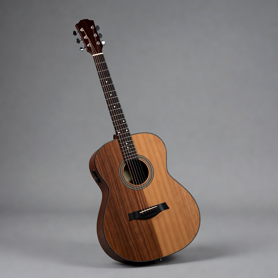 A wooden acoustic guitar with a cutaway body stands leaning against a plain gray background. It features a natural wood finish with darker edges, chrome tuners, and a sound hole. The guitar has a Taylor-style headstock and bridge.