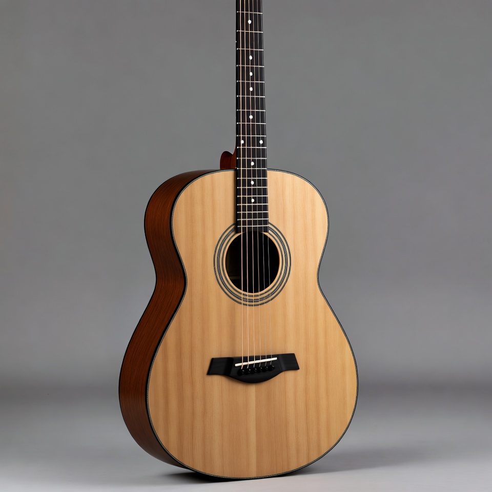 A natural wood acoustic guitar stands upright against a plain gray background. It features a light brown body with darker edges, black fretboard markers, and a round sound hole. The guitar has a truss rod cover and is positioned for a side view.