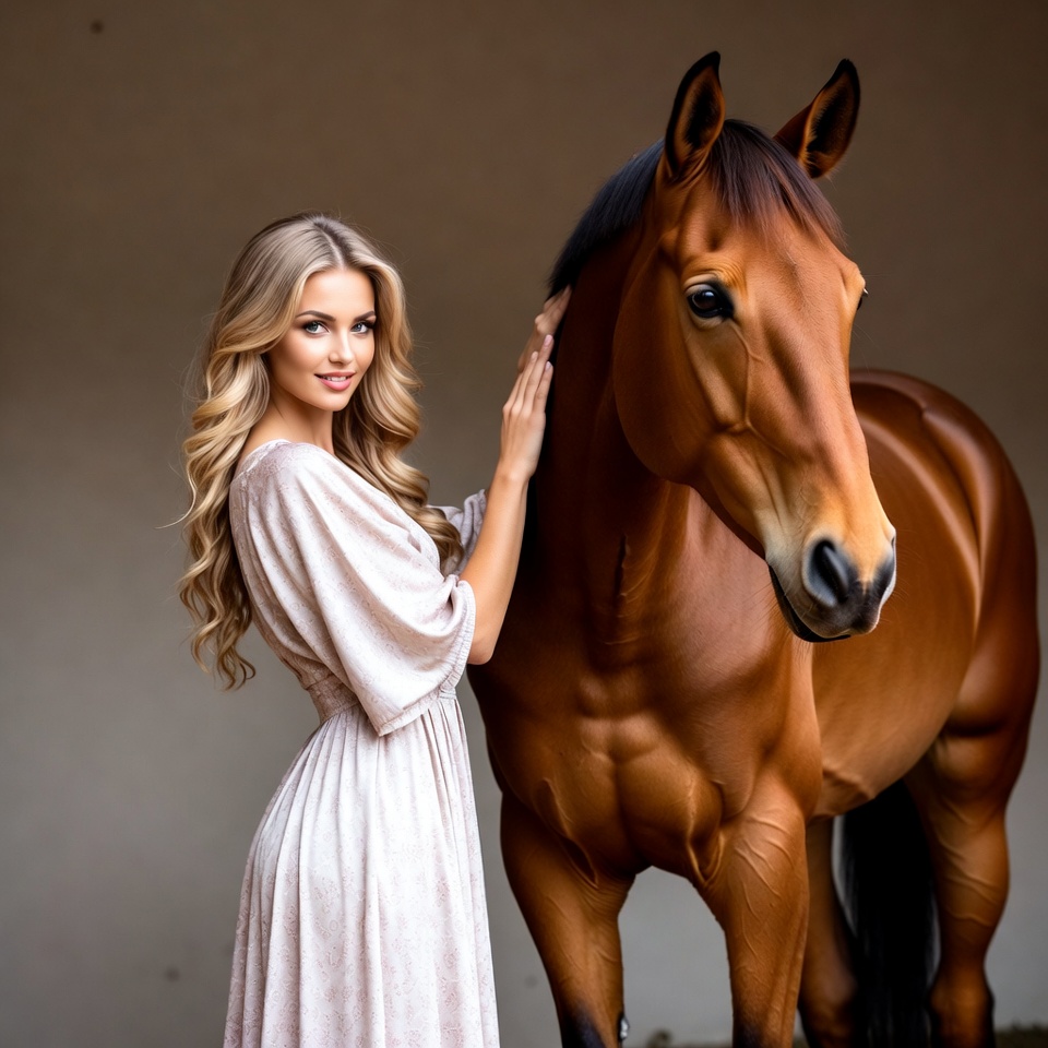 A beautiful blonde woman with long wavy hair stands beside a majestic brown horse in a stable. She wears a flowing beige dress and gently touches the horse's neck. The horse looks directly at the camera with alert eyes.
