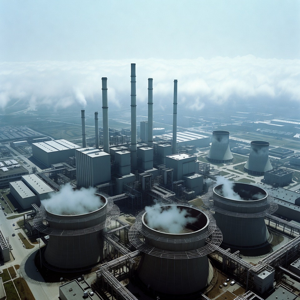 aerial view, chemical plant, chimneys, cloudy sky, cooling towers, emission stacks, energy plant, factories, factory buildings, hazy atmosphere, heavy industry, industrial complex, industrial facility, industrial pipes, infrastructure, manufacturing site, pipes, power station, smokestacks, steam emission, steam plumes, steel towers, utility plant, vapor clouds, power plant