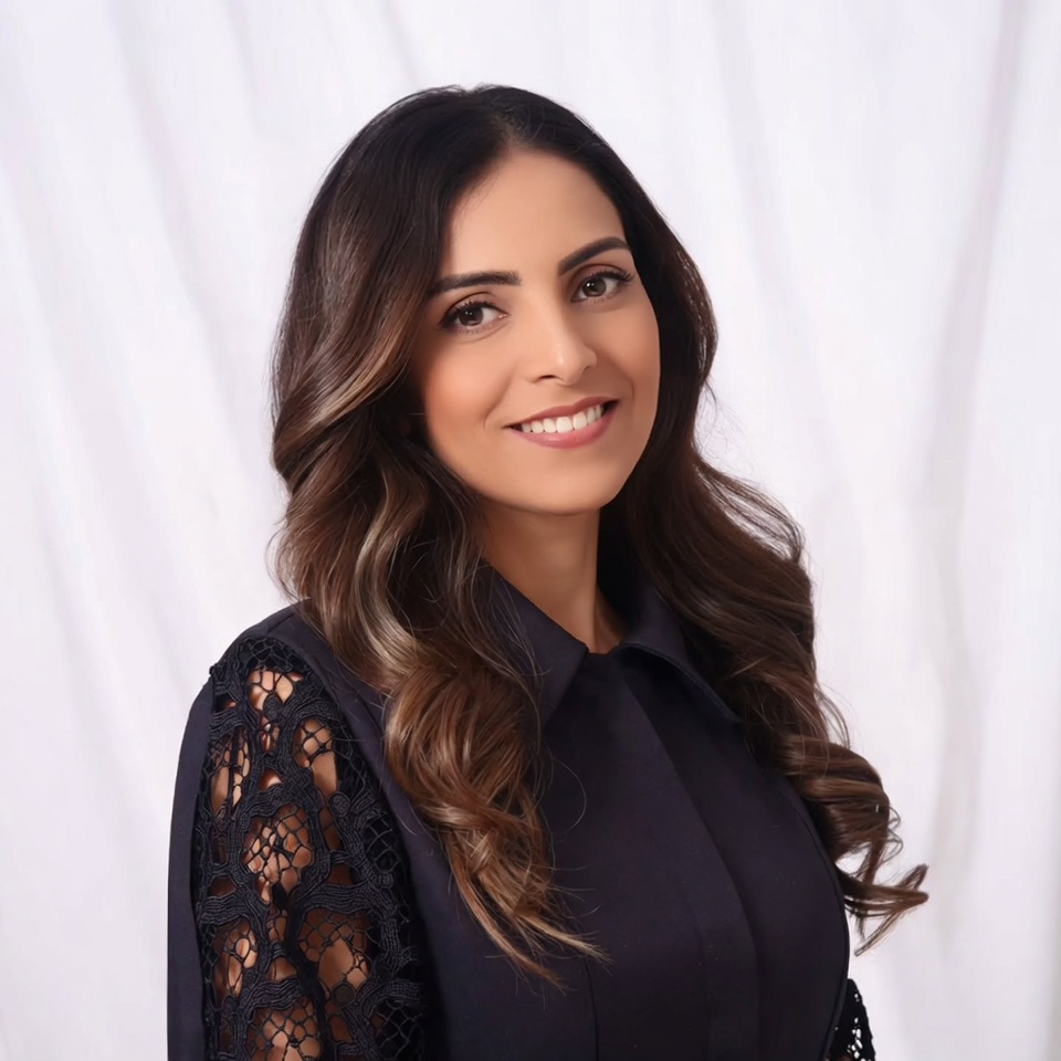 A woman with long, wavy dark brown hair smiles at the camera. She wears a black collared top with lace sleeves and stands against a white draped background. Her expression is warm and confident.