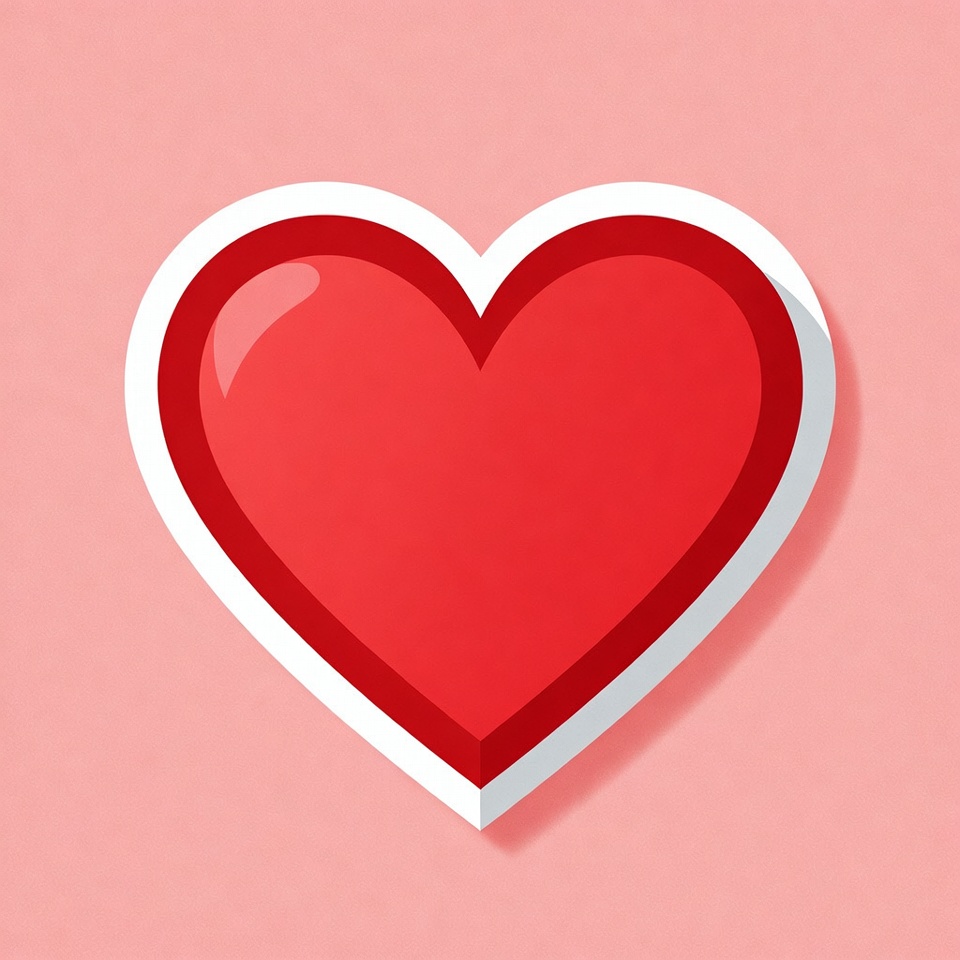 A vibrant red heart with a glossy shine and white outline is designed as a sticker with a subtle shadow. It is centered on a soft pink background. The illustration features a clean, vector-style appearance.