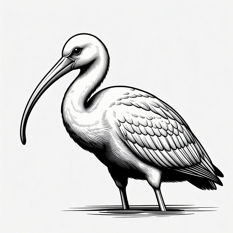 animal, avian, bird, black and white, clipart, curved beak, engraving, feathers, illustration, isolated background, line art, long beak, nature, standing, vector art, wading bird, wildlife, ibis