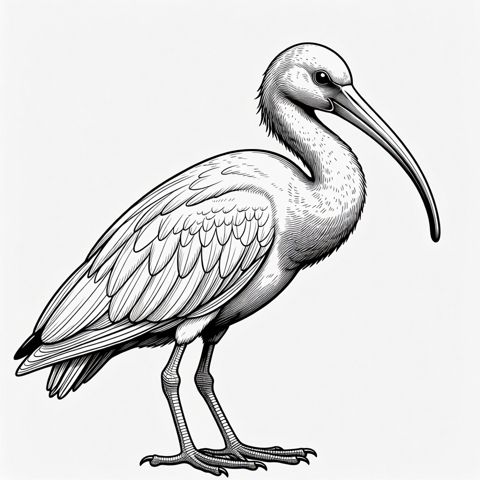 animal, bird, black and white, clipart, curved beak, feathers, illustration, ink drawing, isolated background, line art, long legs, standing, vector art, wading bird, wildlife, ibis