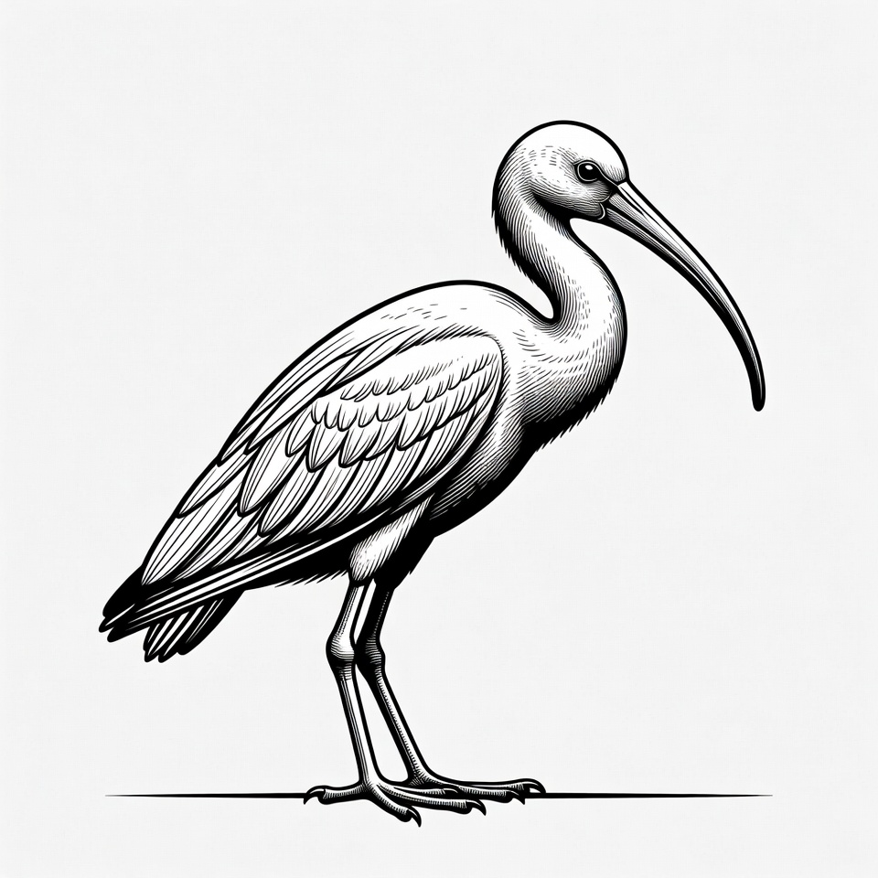 bird, bird legs, black and white, clipart, curved beak, feathers, ibis bird, illustration, isolated background, line art, long beak, standing bird, vector art, wading bird, wildlife illustration, ibis