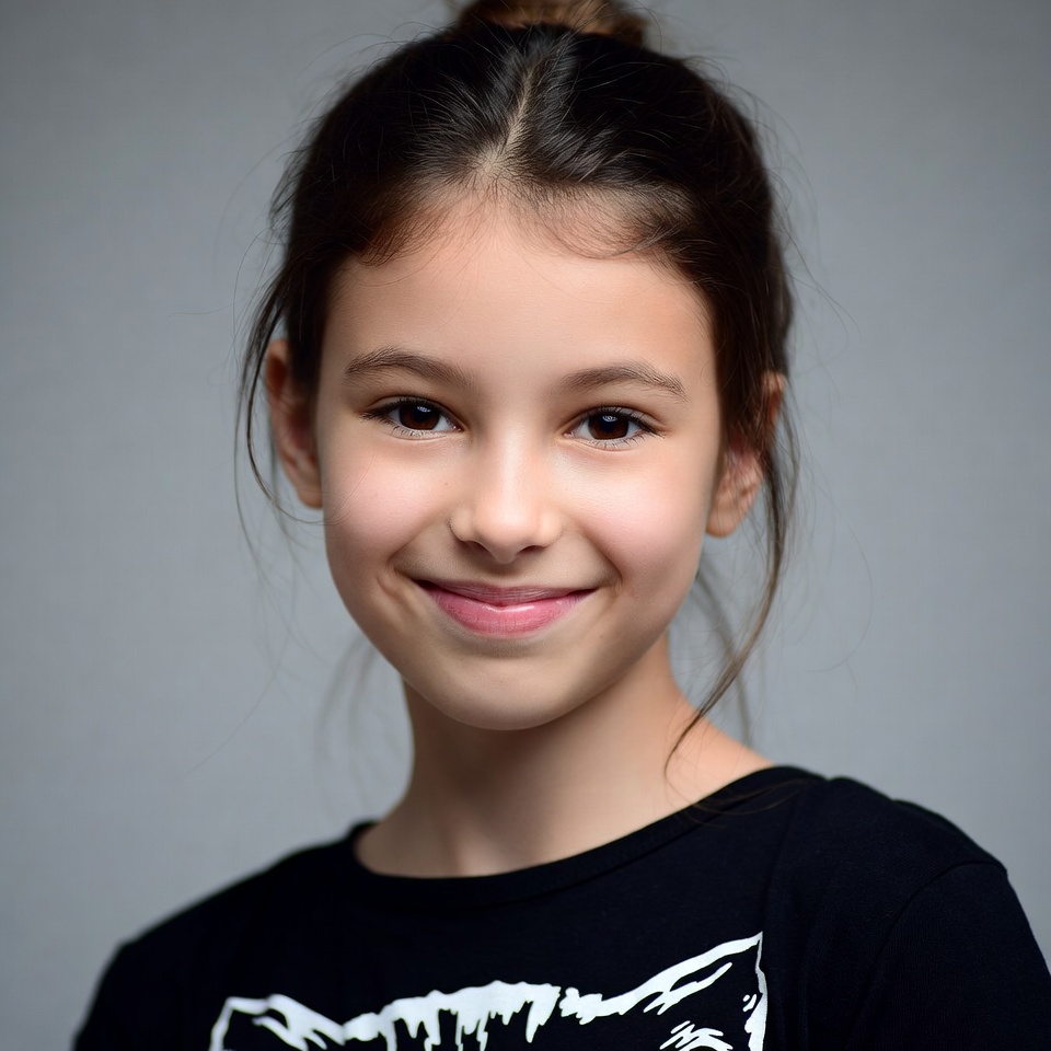 A young girl with dark brown hair tied in a messy bun smiles at the camera. She has expressive brown eyes and wears a black top. The image is a close-up portrait against a plain gray background.