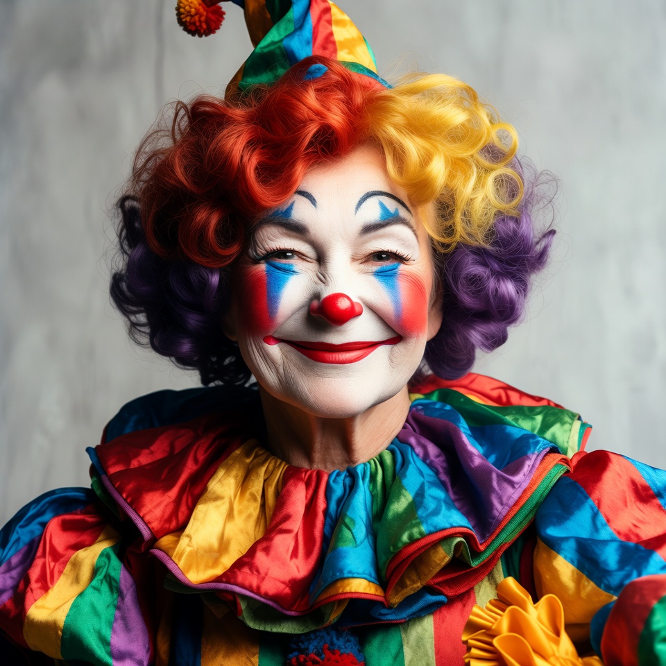 An elderly woman dressed as a clown poses happily against a gray background. She has curly multicolored hair in red, yellow, and purple, heavy white face paint, red nose, and blue eye makeup. She wears a vibrant multicolored ruffled costume and hat with a pom-pom.