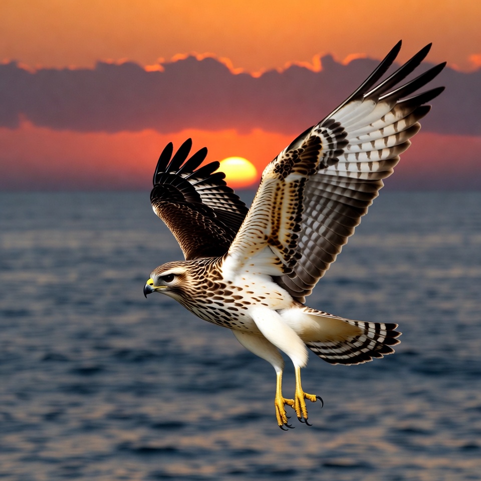 avian, beak, bird, bird of prey, dramatic sky, feathers, flight, flying, golden hour, horizon, nature, ocean, orange sky, raptor, red-tailed hawk, soaring, spotted feathers, sunset, talons, water, wildlife, wings spread, yellow legs, hawk
