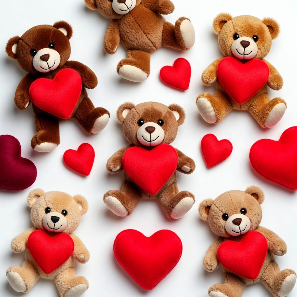 bear toys, brown bears, cheerful bears, cute bears, flat lay, heart shaped, holiday decor, love symbols, lying bears, multiple bears, paw holding, plush toys, red hearts, sitting bears, smiling bears, soft toys, stuffed animals, toy bears, valentines day, white background, teddy bears