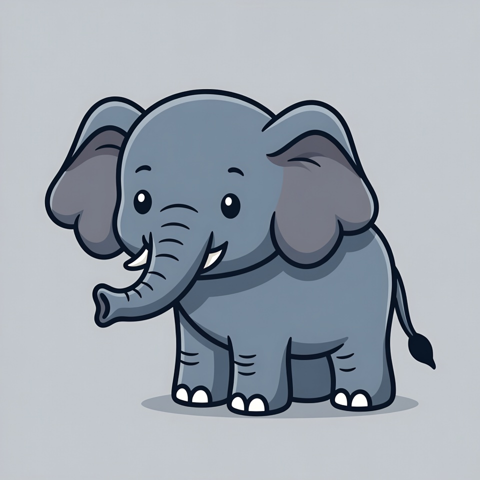 A cute cartoon illustration of a baby elephant with large ears, trunk, and tusks stands on a plain background. The elephant has a smiling face with big eyes and short legs. It is depicted in gray tones with black outlines in a kawaii style.