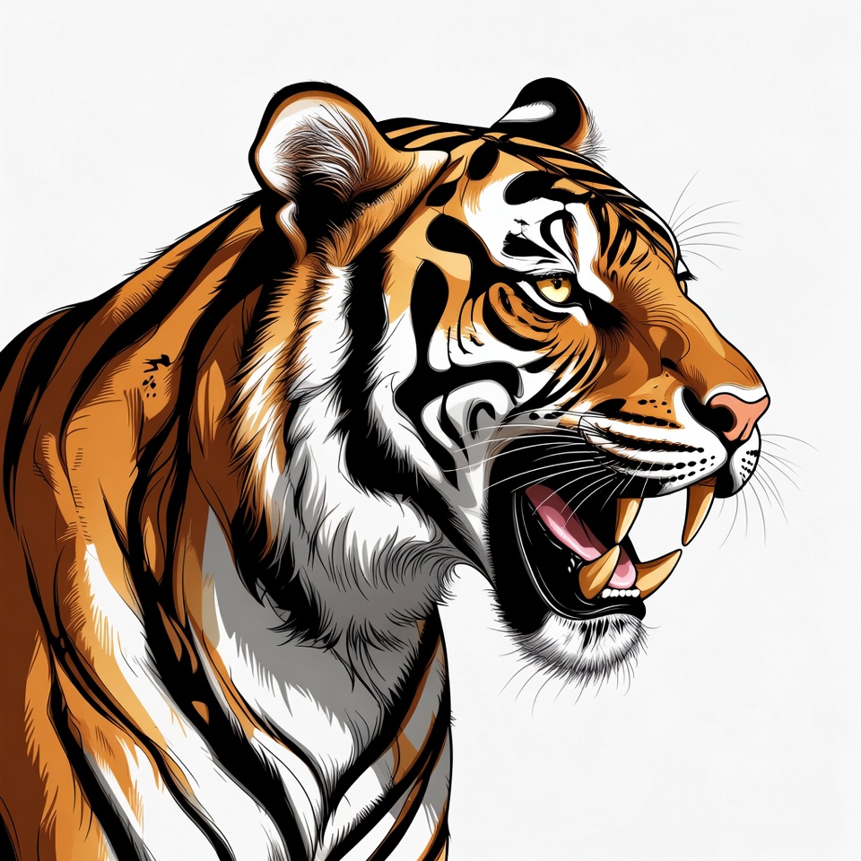 A detailed vector illustration of a tiger's head in profile view against a white background. The tiger features bold orange fur with black stripes, intense green eyes, and an open mouth revealing sharp white fangs. Its ears are perked up and whiskers are prominent.