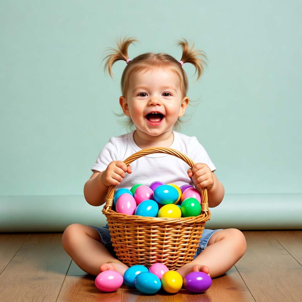 A happy baby girl with blonde pigtails sits on the floor holding a woven basket overflowing with colorful Easter eggs. She wears a white onesie and denim shorts, smiling widely with excitement. Some eggs spill out onto the light green background and wooden floor.