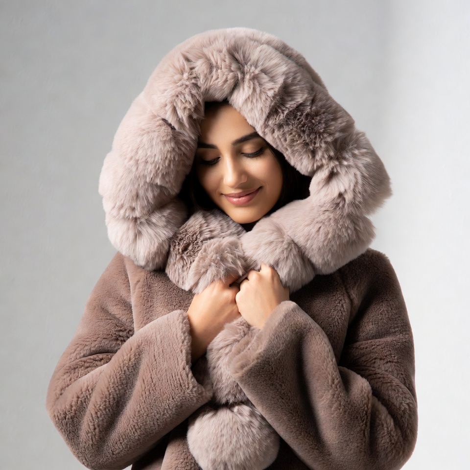 A young woman with dark expressive eyes and a subtle smile wears a plush light brown fur hooded coat. The oversized hood frames her face, and she clasps the coat closed at her chest with both hands. She poses against a plain gray background.