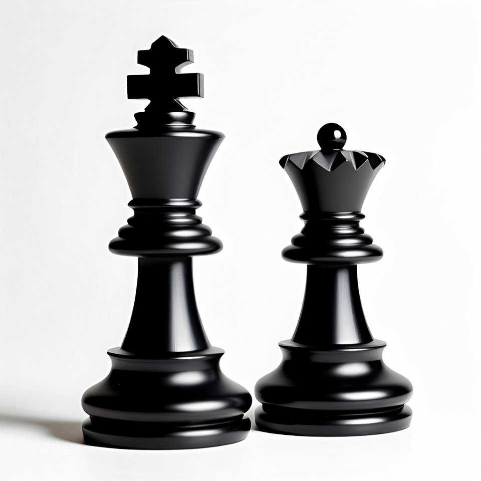 A black chess king stands tall next to a slightly shorter black chess queen on a plain white background. Both pieces feature glossy black finishes with detailed crowns and bases. They are positioned side by side in a 3D rendered style.