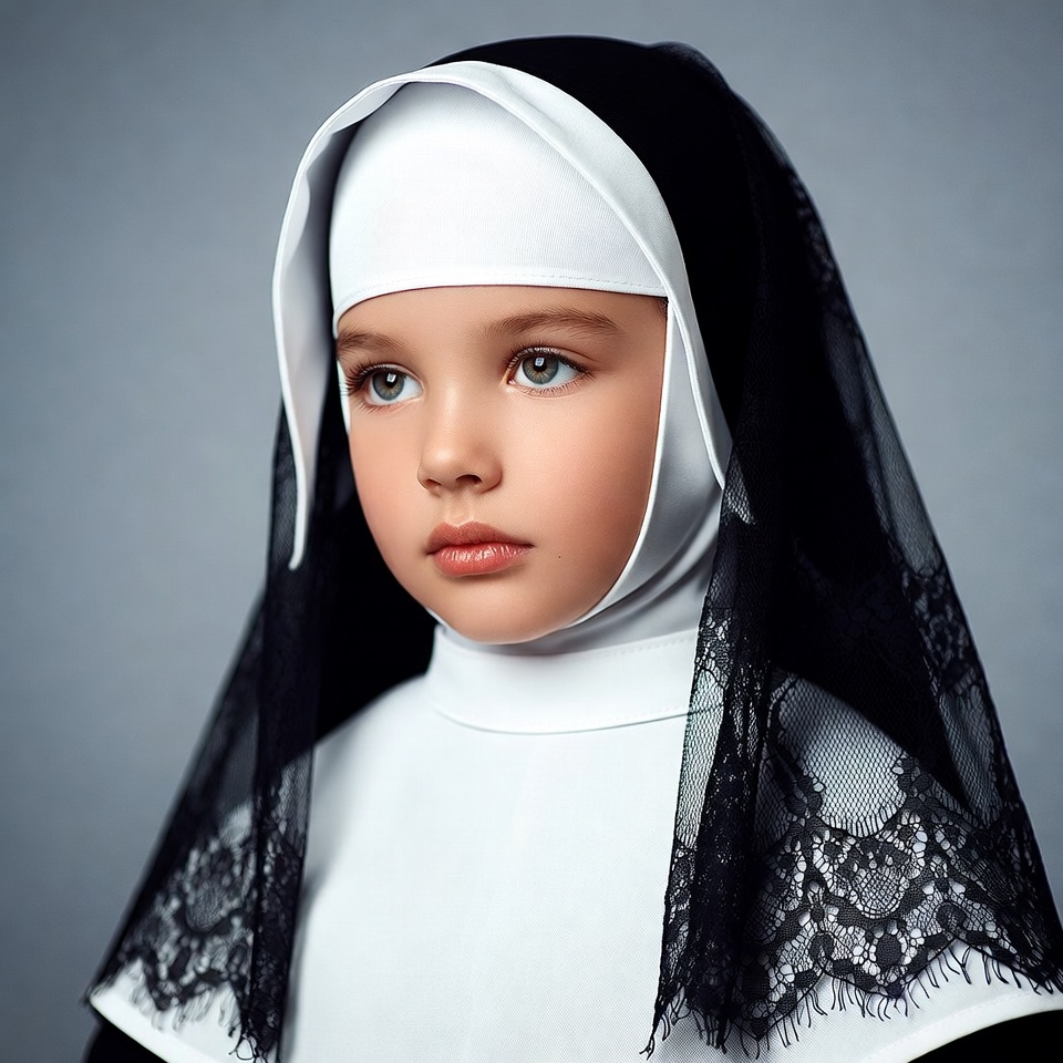 White, black veil, blue eyes, child nun, fair skin, female, isolated background, lace trim, nun, nun habit, portrait, religious clothing, religious habit, white wimple, young girl, girl