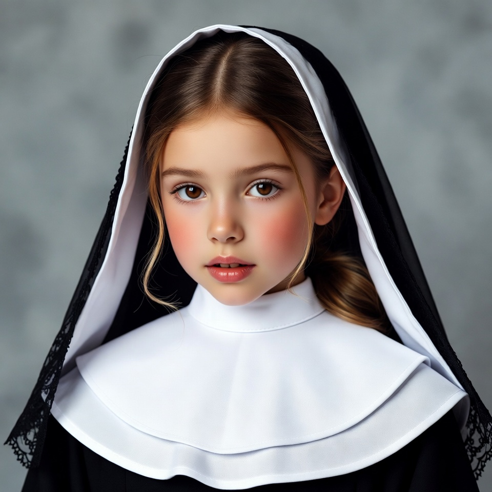 A young girl with brown hair and rosy cheeks wears a traditional black nun's habit with white collar and veil. She gazes directly at the viewer with large brown eyes and subtle pink lipstick. The image features a plain gray background.