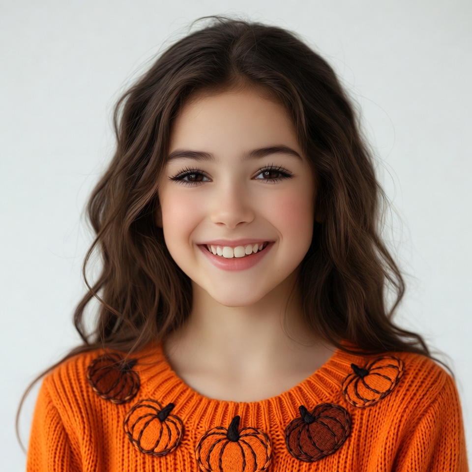 A young girl with long wavy brown hair smiles happily at the camera against a white background. She wears an orange knit sweater decorated with embroidered pumpkins around the crew neck. Her expressive eyes and bright smile are prominently featured in the close-up portrait.