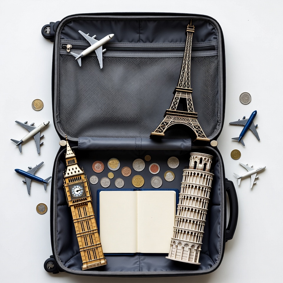 An open black suitcase on a white background contains toy models of the Eiffel Tower, Big Ben, and Leaning Tower of Pisa. Small toy airplanes and scattered coins surround the landmarks inside the suitcase. An open blank notebook rests among the travel souvenirs.