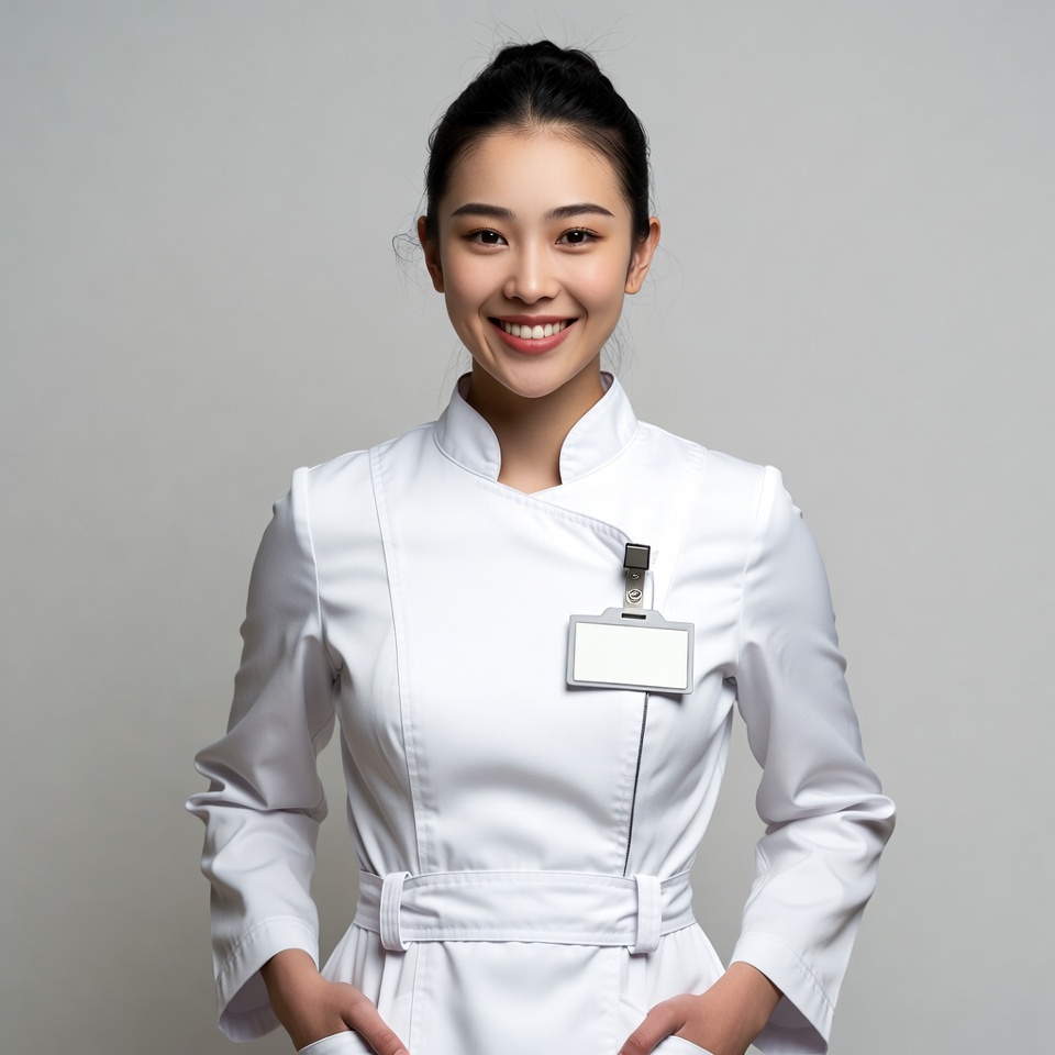 A young Asian woman wearing a white nurse uniform stands against a plain gray background. She has her black hair in a neat bun, a name badge on her chest, and smiles warmly with hands in her pockets. The uniform features long sleeves, a belt, and a collared design.