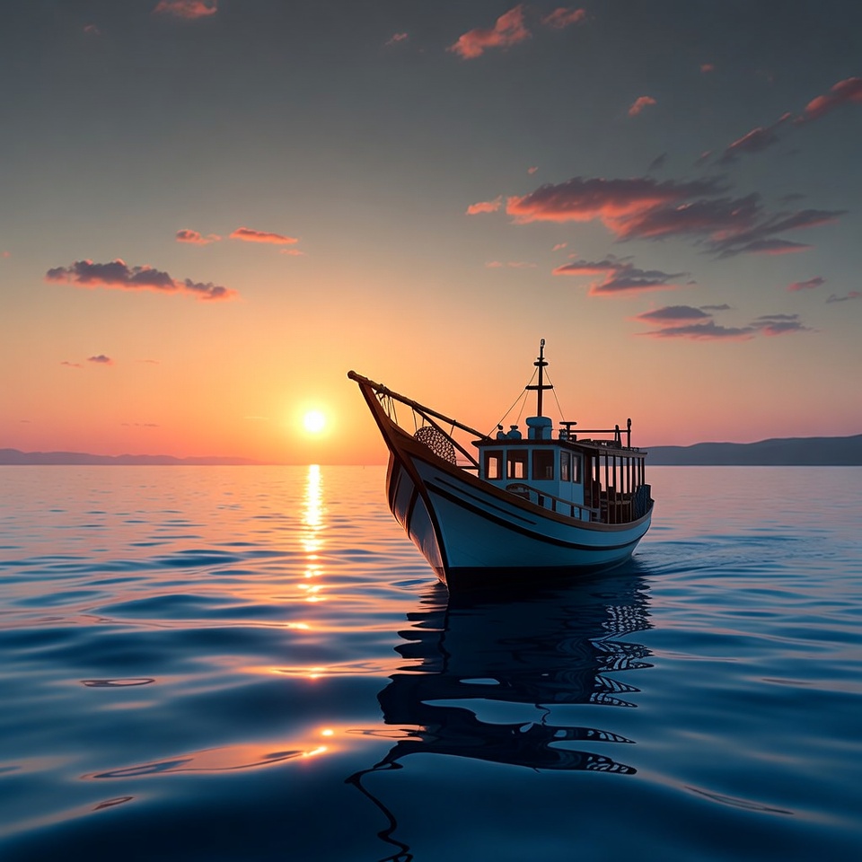 A traditional wooden dhow boat with white hull and curved prow floats calmly on a serene sea at sunset. The sun's orange glow reflects on the water, with scattered clouds in the sky and distant mountains on the horizon. The boat's details include a small cabin, mast, and rigging.