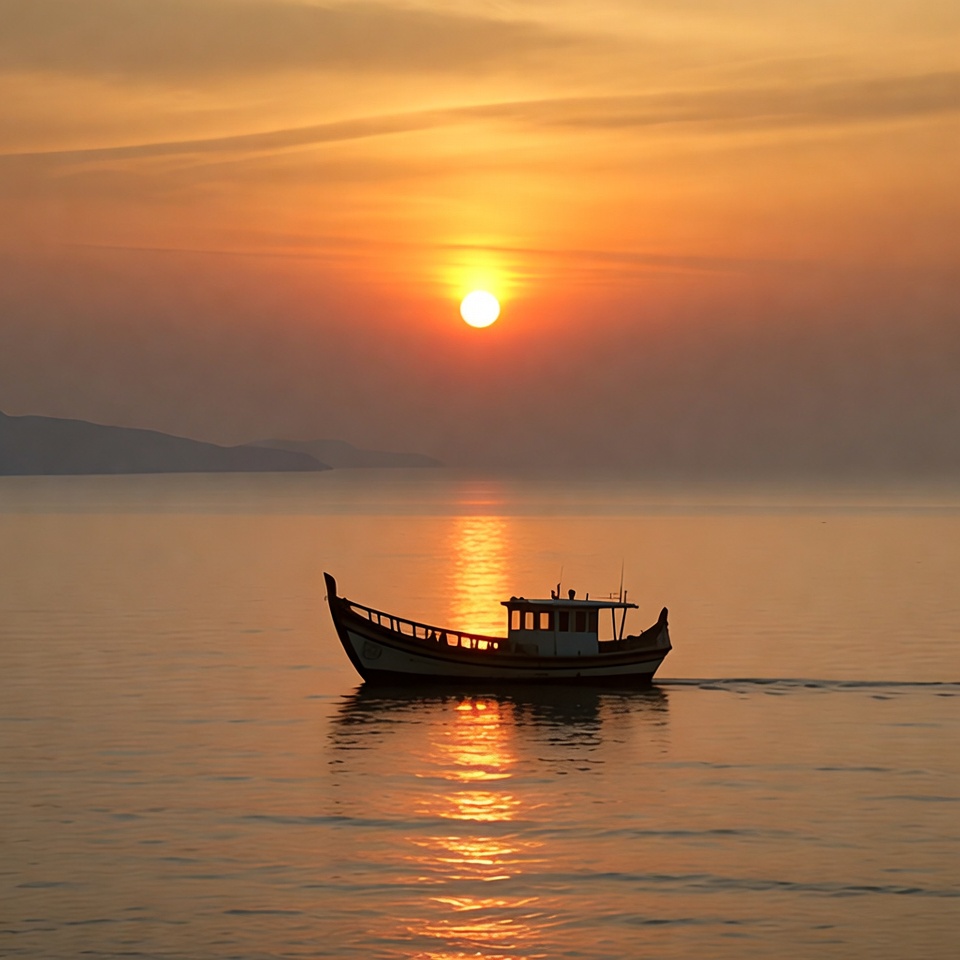 A traditional wooden fishing boat with a curved bow sails calmly on a serene lake during sunset. The bright orange sun hangs low over distant hazy mountains, casting a warm glow and reflections on the calm water. The boat's silhouette is sharply defined against the vibrant sky.