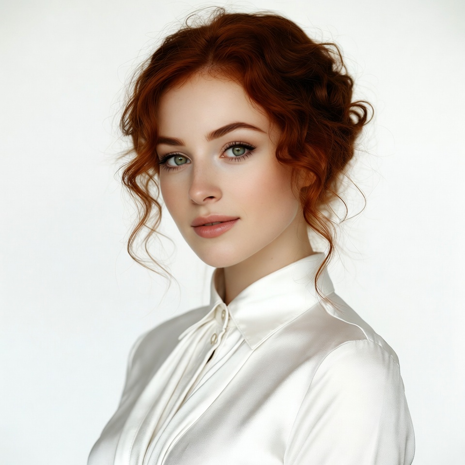 White, collared shirt, curly hair, fair skin, female, green eyes, headshot, isolated background, makeup, pink lips, portrait, red hair, redhead, satin blouse, updo hairstyle, white blouse, woman