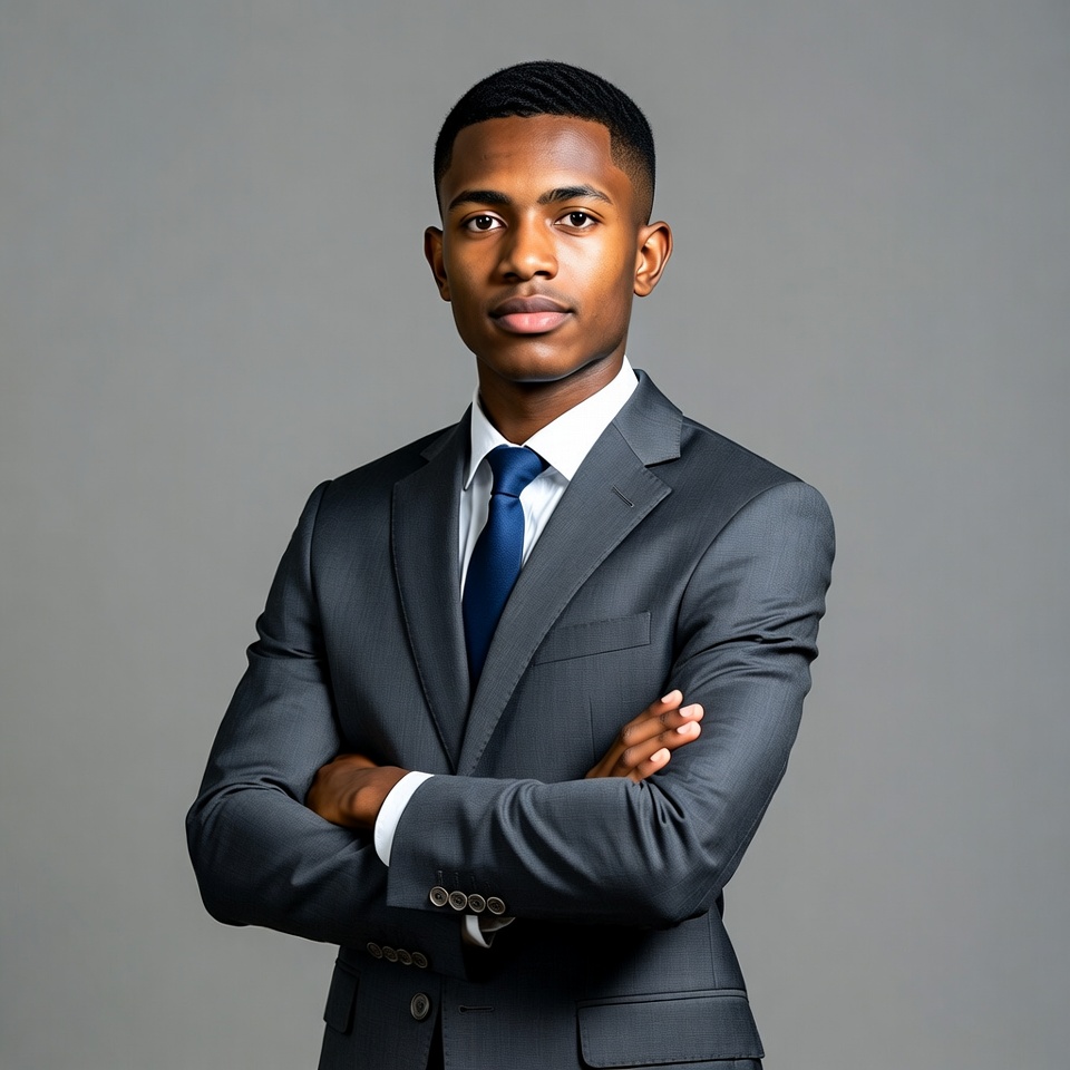 A young African-American man stands confidently with arms crossed against a plain gray background. He wears a tailored gray suit, white dress shirt, and blue tie, with short black hair and a serious expression. His posture is poised and professional.