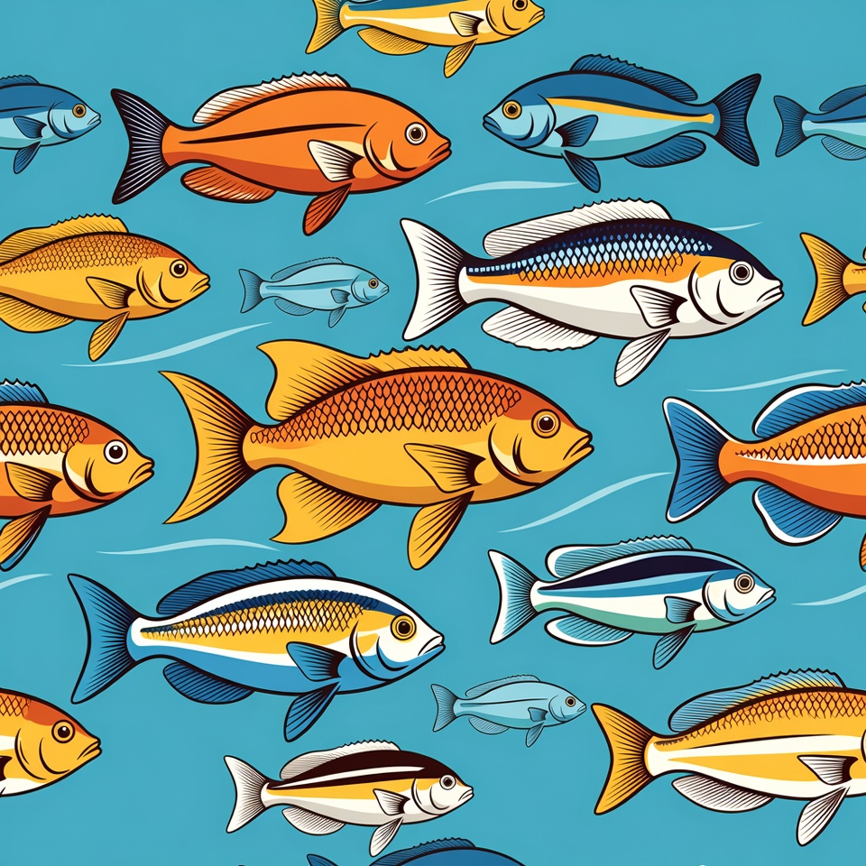 angelfish, blue background, blue fish, colorful fish, digital art, fish graphics, fish illustration, fish pattern, fish school, goldfish, graphic pattern, marine animals, ocean pattern, orange fish, pattern design, repeating pattern, sea life, seamless pattern, striped fish, swimming fish, underwater pattern, vector illustration, vibrant colors, yellow fish, tropical fish