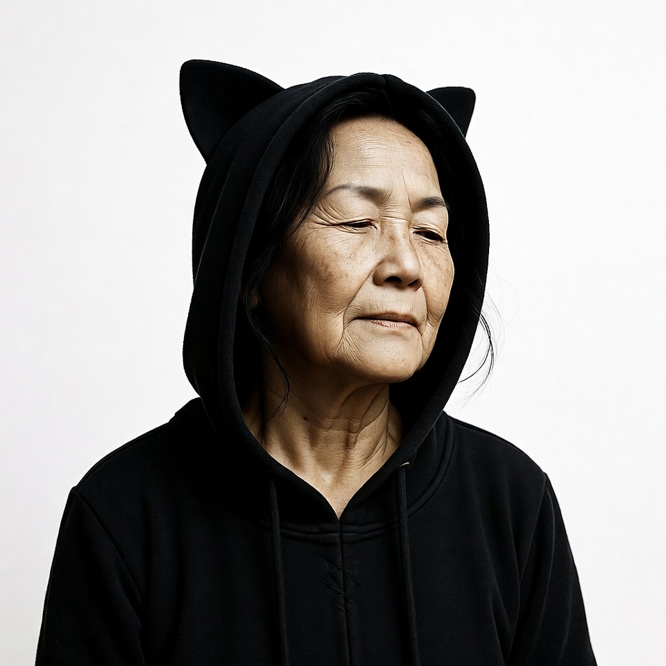 An elderly Asian woman with short dark hair wears a black hoodie featuring prominent cat ears on the hood. She gazes slightly downward with a neutral expression against a plain white background. The hoodie covers her shoulders and is zipped up at the front.