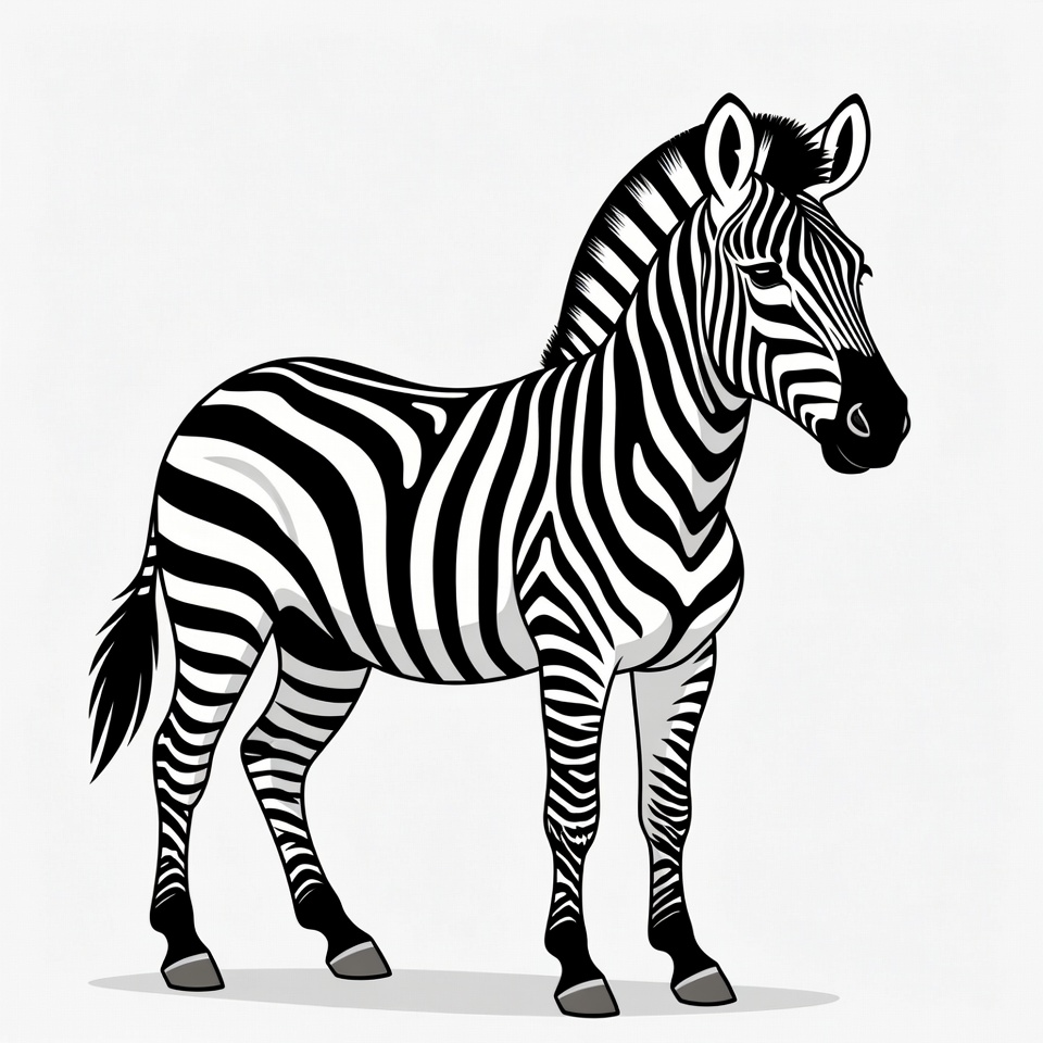 A black and white illustration of a zebra stands in a side profile view. The zebra features bold black stripes on a white coat, with a prominent mane, pointed ears, and a bushy tail. It is depicted on a plain isolated background.
