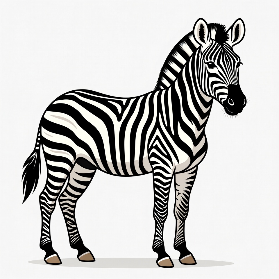 A black and white zebra stands in a side profile view on a plain white background. The illustration features bold black stripes across its body, mane, and tail. It has a detailed face with prominent ears and hooves.