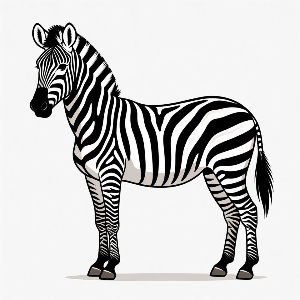 A black and white illustration of a zebra stands in profile view. It features bold black stripes on a white body, with detailed ears, mane, and tail. The zebra is depicted on a plain white background with subtle shadows under its hooves.