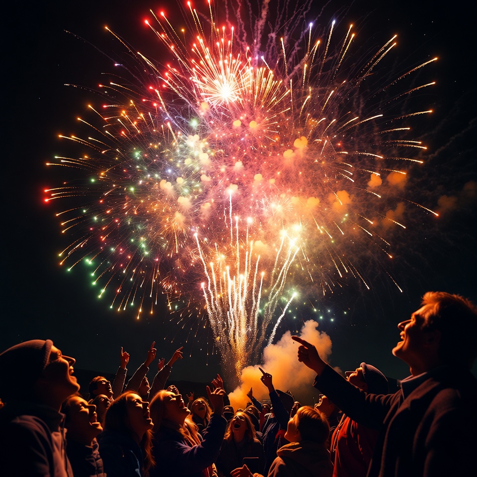 blue fireworks, celebration, colorful fireworks, crowd, dark background, diverse group, exploding fireworks, festive display, green fireworks, group watching, hats, joyful crowd, men, night, night sky, orange fireworks, people, pointing up, raised hands, red fireworks, sky burst, winter coats, women, fireworks