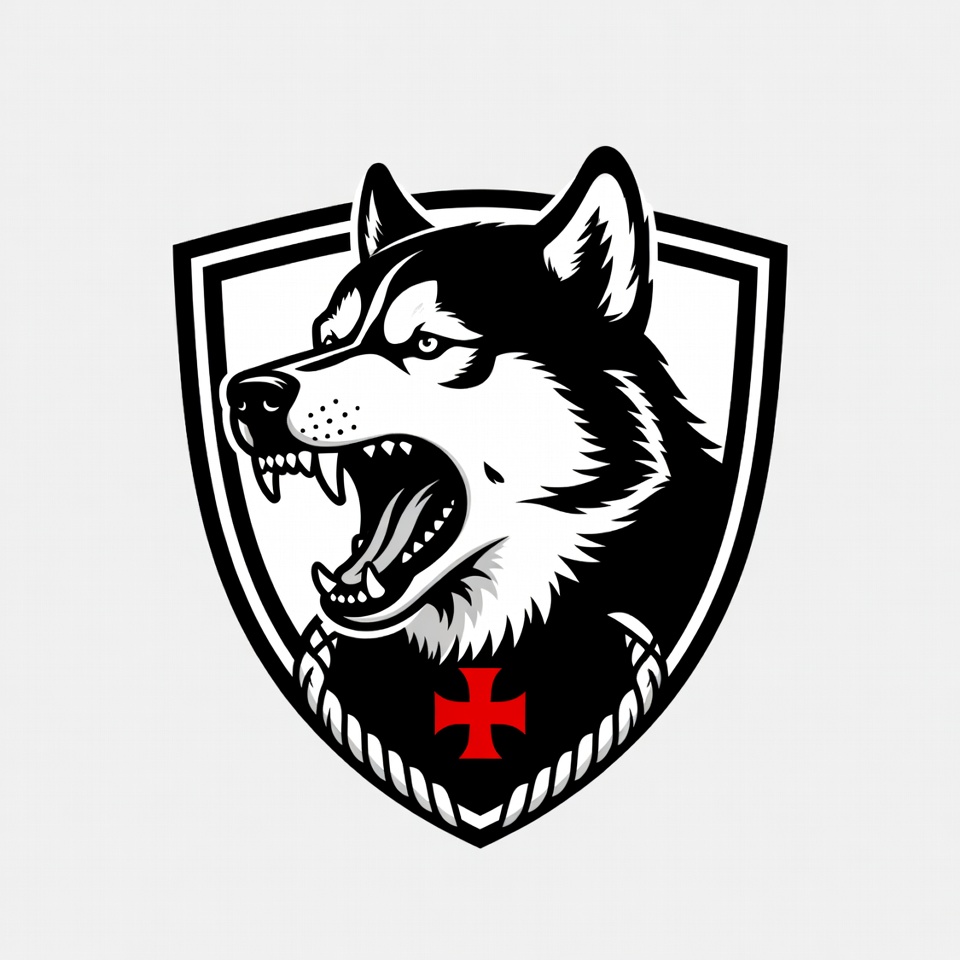 Siberian Husky, animal, badge, barking, black and white, canine, clipart, dog, emblem, fierce, growling, illustration, isolated background, logo, mascot, red cross, rope, shield, snarling, vector, husky
