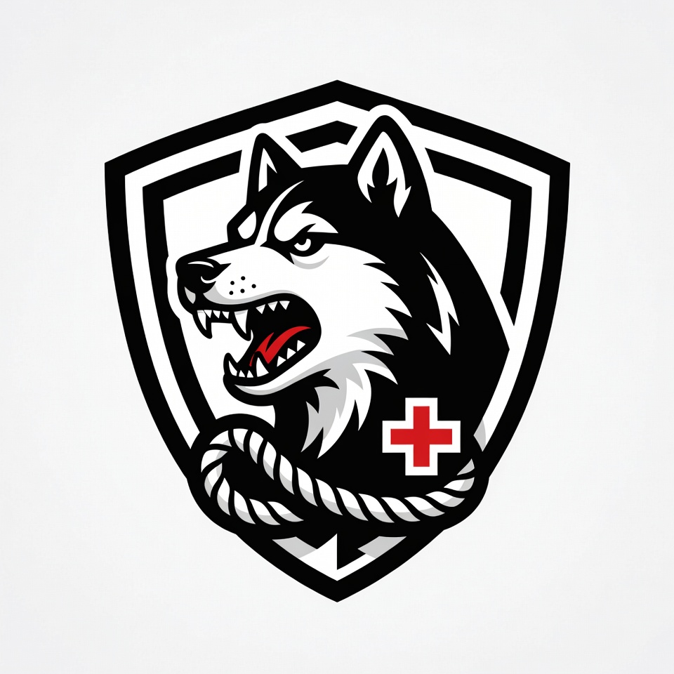 aggressive, badge, black white, canine, clipart, dog, emblem, fangs, fierce dog, graphic design, growling, illustration, isolated background, logo, mascot, medical symbol, red cross, rope, shield, siberian husky, snarling, teeth, vector, husky