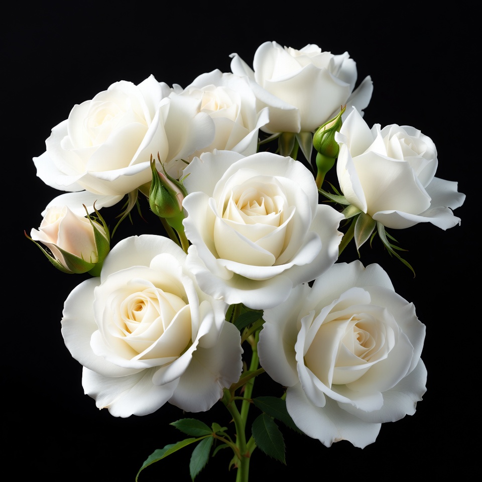 black background, blooming roses, bouquet, floral arrangement, flower cluster, flower photography, flowers, fresh roses, green stems, isolated flowers, petals, rose bouquet, rose buds, roses, white flowers, white roses