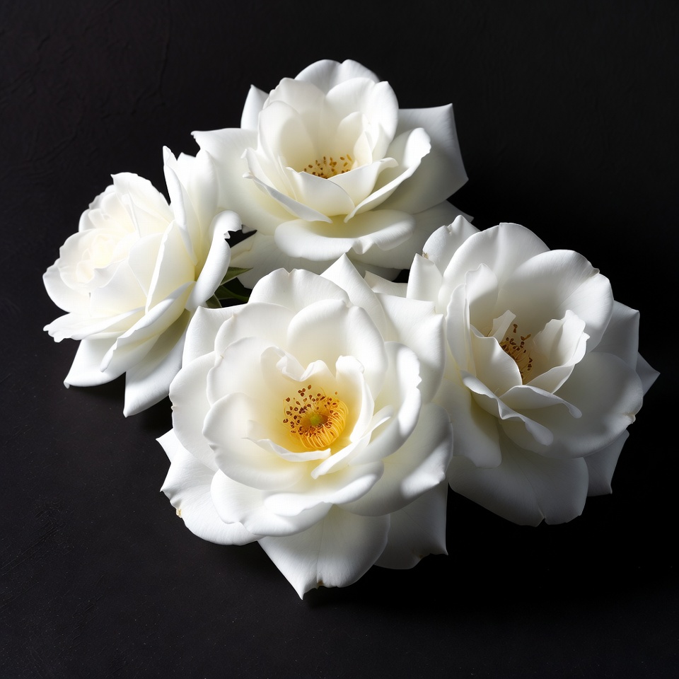 A cluster of blooming white roses with yellow centers is arranged on a solid black background. The petals are soft and layered, creating a striking contrast against the dark surface. Each rose shows detailed stamens and fresh blooms.