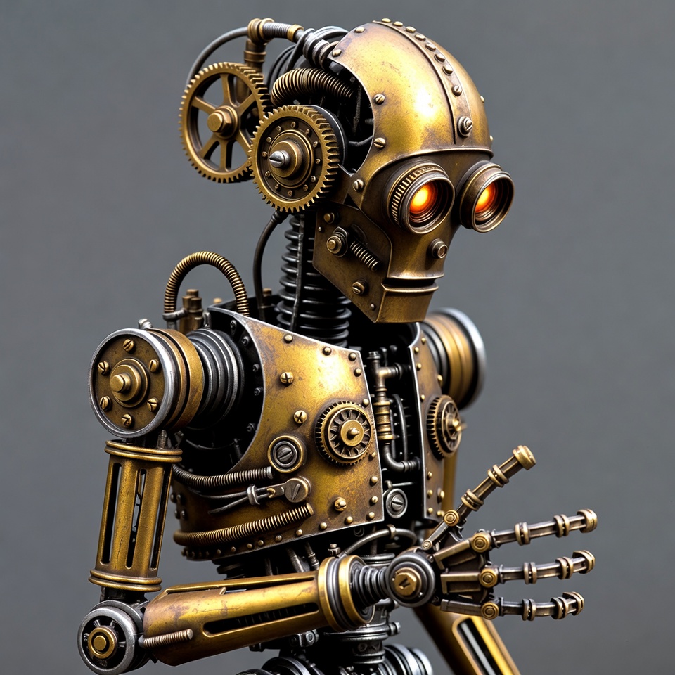 A detailed steampunk robot stands against a dark background. It features a brass-colored metallic body with numerous gears, cogs, and mechanical joints. The robot has glowing orange eyes and articulated metal hands.