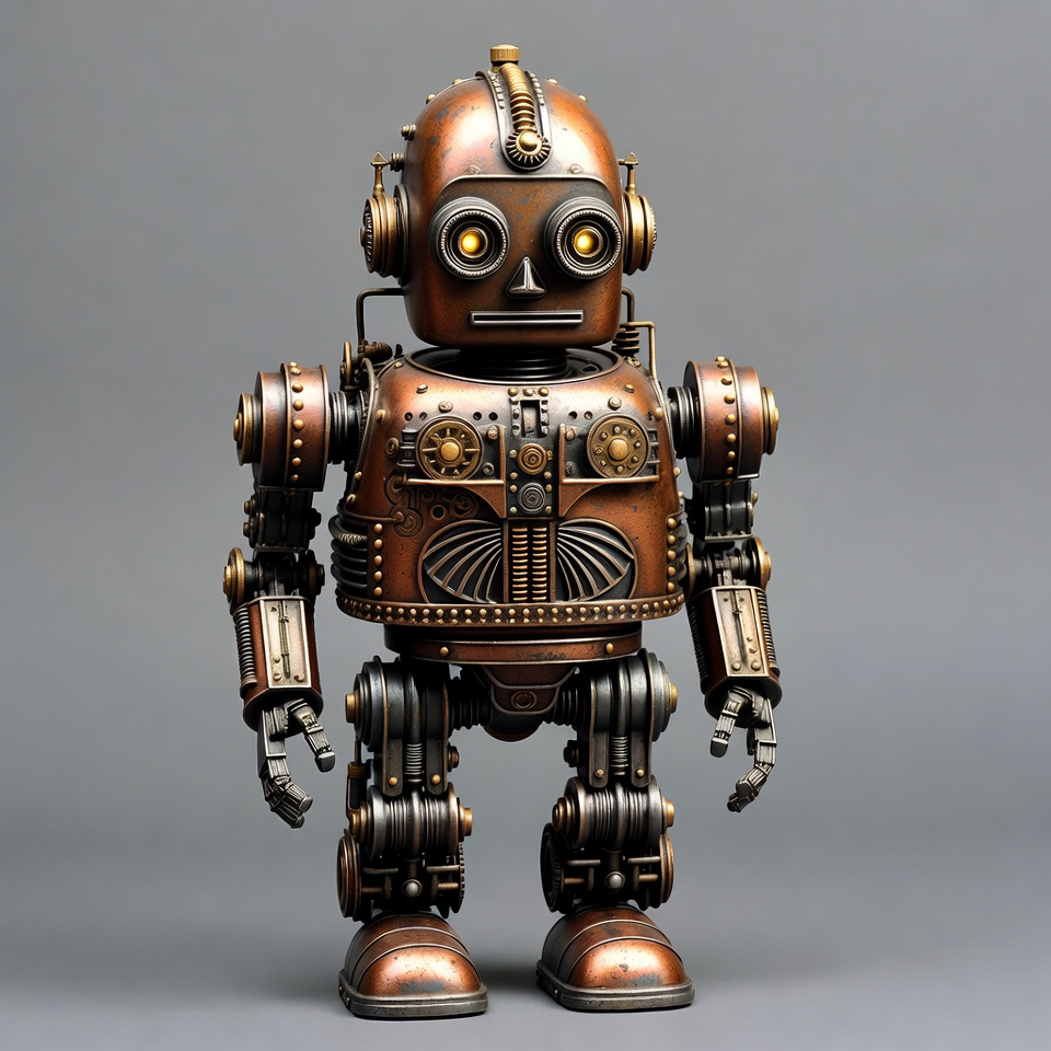 automaton, brass robot, copper robot, futuristic, gears, goggles, headphones, isolated background, machine, mechanical robot, metallic, pipes, retro robot, robot, steampunk, toy robot, vintage robot, yellow eyes, steampunk robot