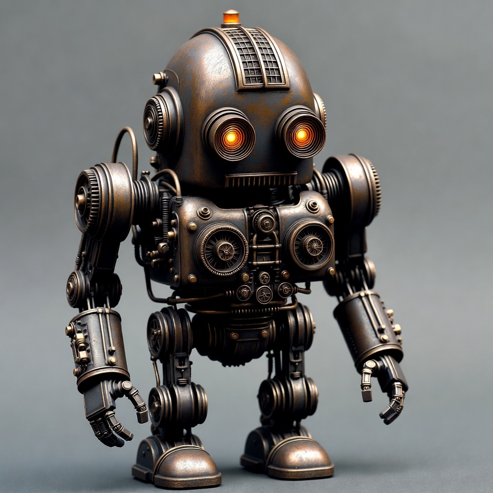 A small steampunk-style robot with a round head, glowing orange eyes, and bronze metallic body stands on a plain gray background. It features mechanical gears, antennas, gauges, and riveted panels on its arms, chest, and legs. The robot has a retro-futuristic design with a top-mounted orange light.