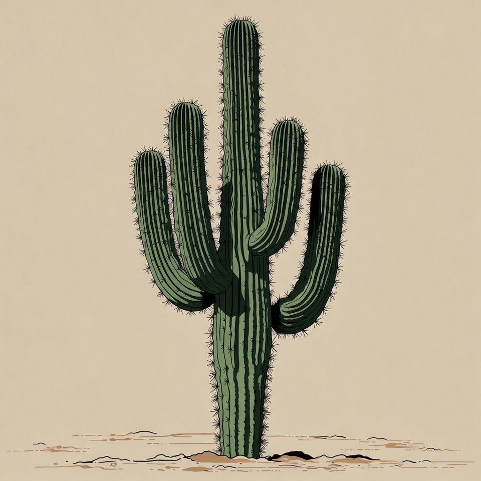 A tall green cactus with multiple arms stands prominently against a beige background. The plant features thick, spiny pads and a sturdy base planted in light brown sand. The illustration has clean lines and a minimalist style.