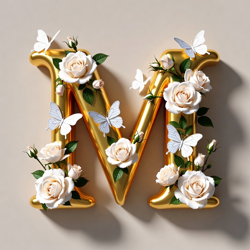 Golden M Letter with Roses and Butterflies