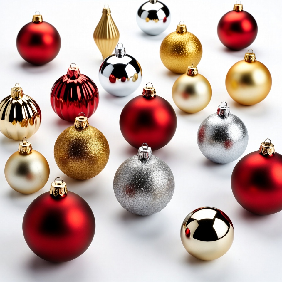 Christmas balls, Christmas decor, baubles, bell ornaments, festive decor, glitter baubles, glossy finish, gold balls, gold ornaments, hanging ornaments, holiday baubles, holiday decorations, metallic ornaments, ornament collection, red balls, red ornaments, round ornaments, shiny baubles, shiny spheres, silver balls, silver ornaments, textured baubles, white background, Christmas ornaments