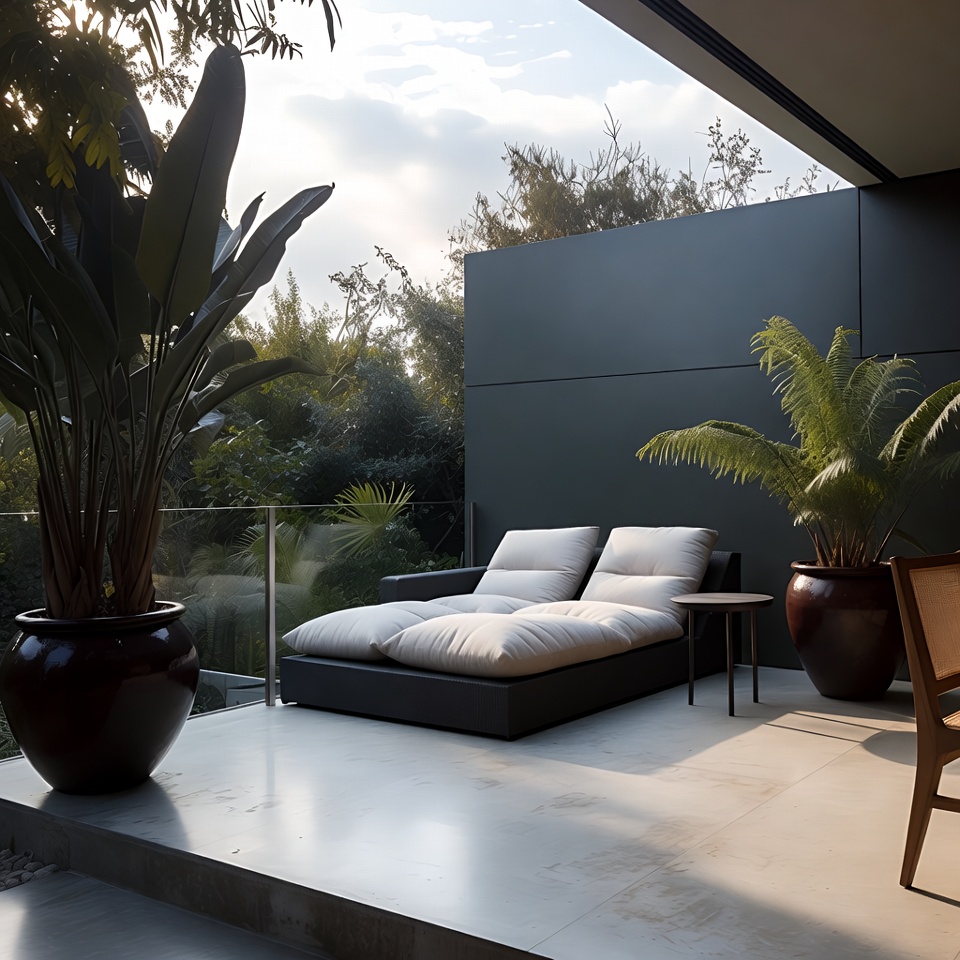 balcony, banana leaves, beige cushions, black frame, contemporary design, dark wall, ferns, garden furniture, glass railing, gray tiles, large pots, lush greenery, luxury patio, modern architecture, outdoor furniture, outdoor seating, poolside lounge, potted plants, relaxation area, resort terrace, round table, sky view, sunlight, terrace, tropical garden, tropical plants, wooden chair, modern daybed